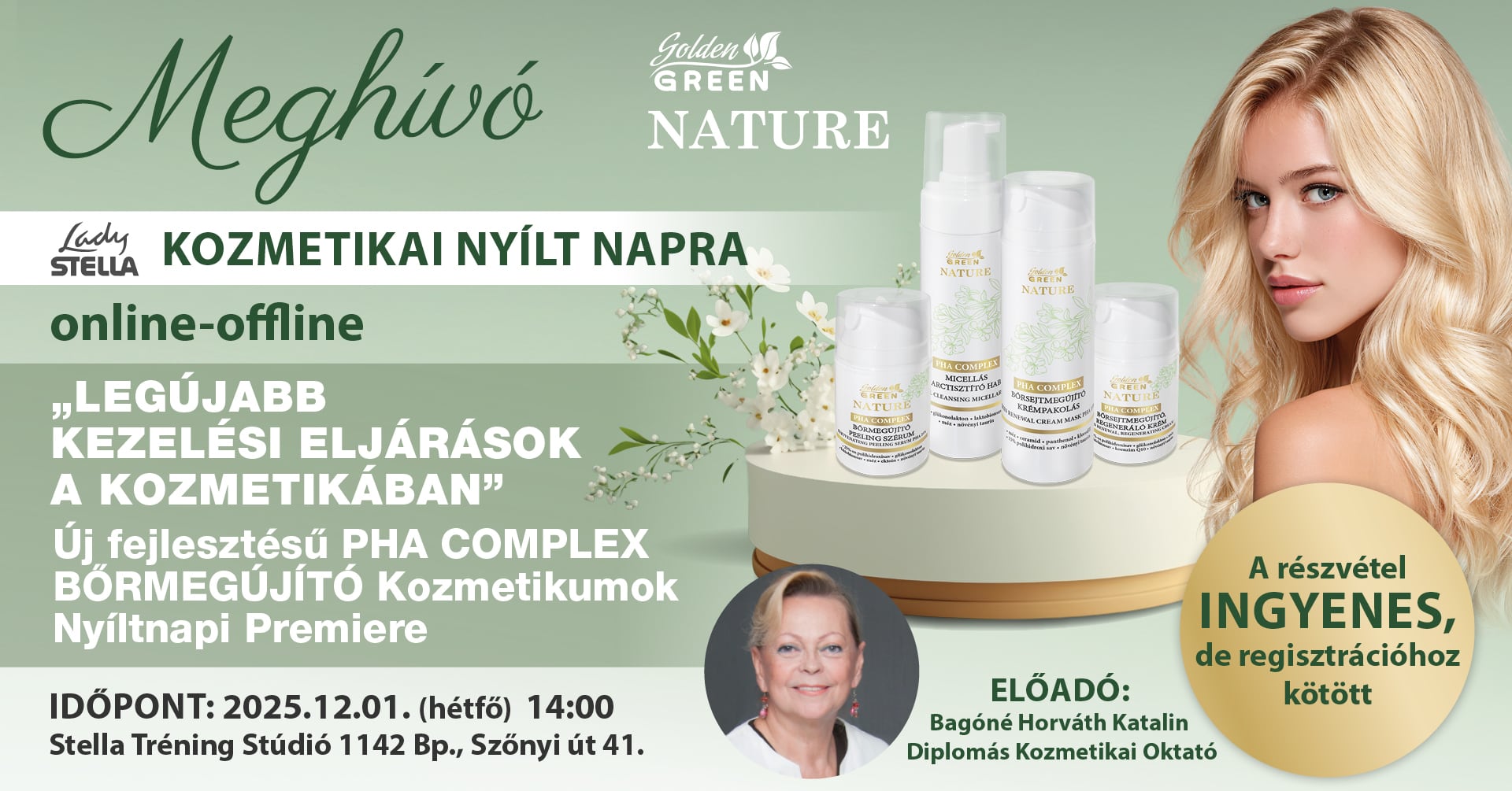 Szeretettel várunk a legújabb fejlesztésű Golden GREEN Nature PHA COMPLEX kozmetikumok NYÍLT NAPI premierére, ahol megismerkedhetsz: