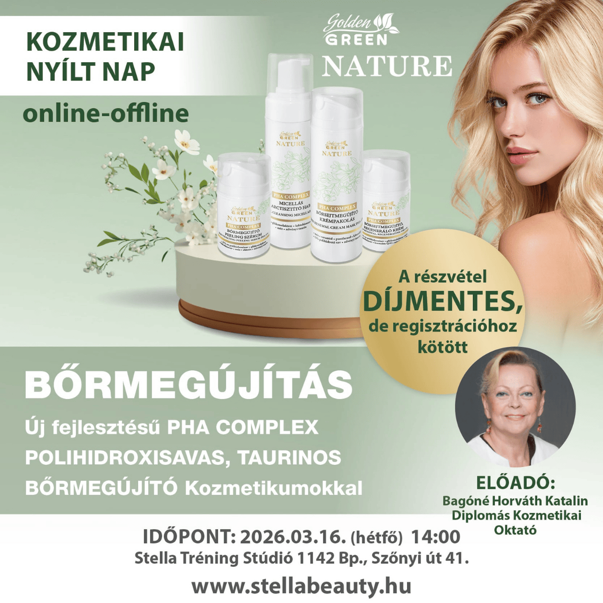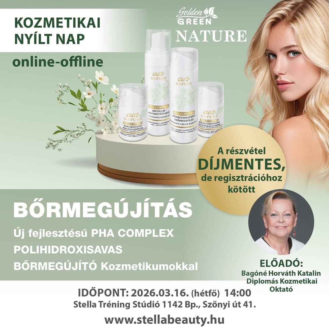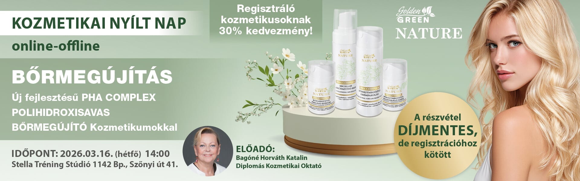 Kozmetikai NYÍLT NAP - 2026.03.16. Golden GREEN PHA (online-offline)